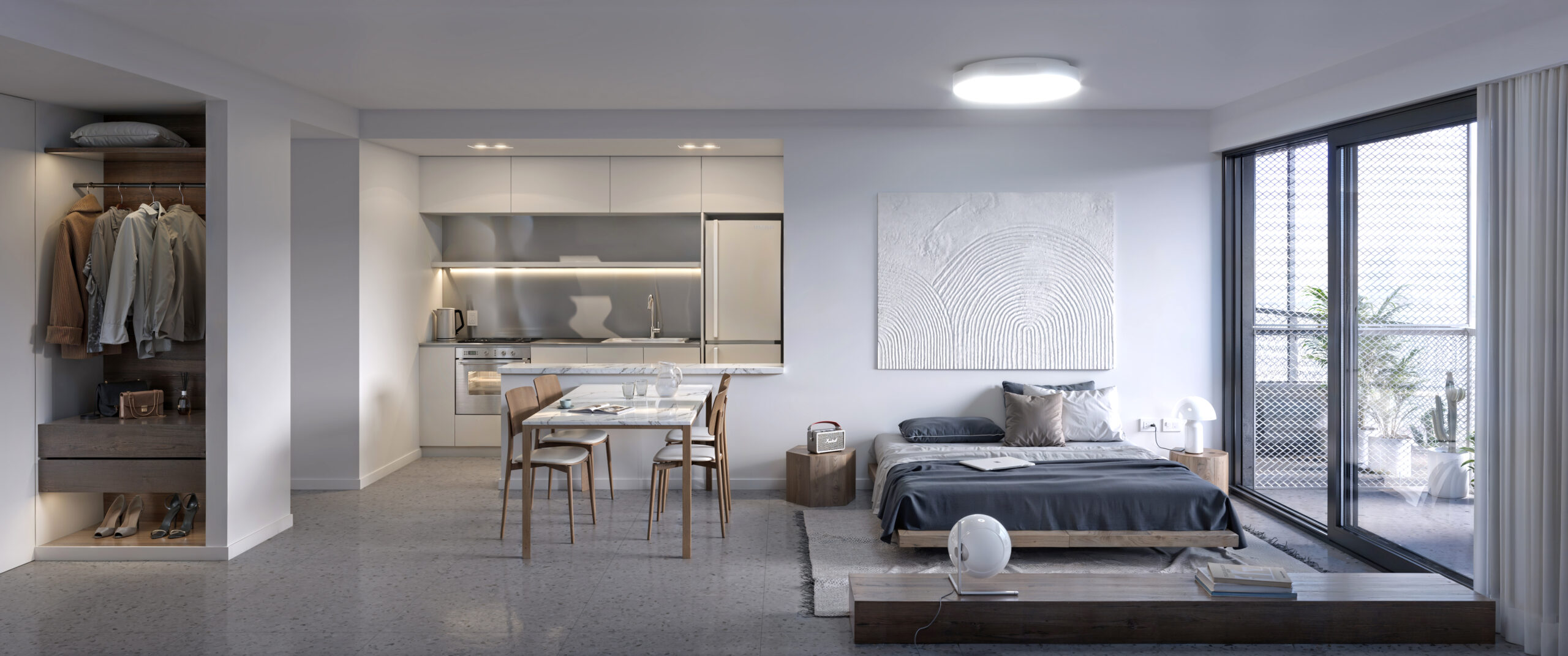 Ambiente único con cocina integrada, baño completo y balcón. Ideales para renta o primera vivienda